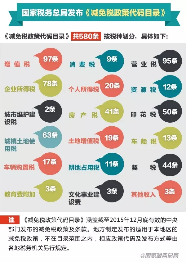 新版《減免稅政策代碼目錄》(以下簡稱《代碼目錄》)包括580條,涉及增值稅、消費稅、營業(yè)稅、企業(yè)所得稅、個人所得稅、資源稅、房產(chǎn)稅、城市維護建設(shè)稅、印花稅、契稅、城鎮(zhèn)土地使用稅、土地增值稅、車船稅、車輛購置稅、耕地占用稅、教育費附加和文化事業(yè)建設(shè)費等。