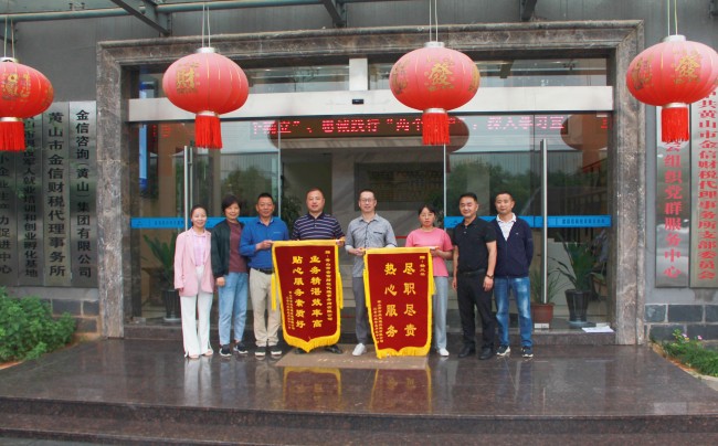 2023年6月6日,黃山市百慶交通設施有限公司李總經(jīng)理將繡有“業(yè)務精湛效率高,貼心服務素質好”字樣的錦旗送到我金信咨詢(黃山)集團有限公司總經(jīng)理胡海鋒手中,感謝我金信集團多年來在雙方合作中給予的大力支持和幫助。并向財稅代理經(jīng)理楊鳳琴贈送一面“盡職盡責、熱心服務”的個人錦旗,表達對楊鳳琴經(jīng)理的感謝之情。